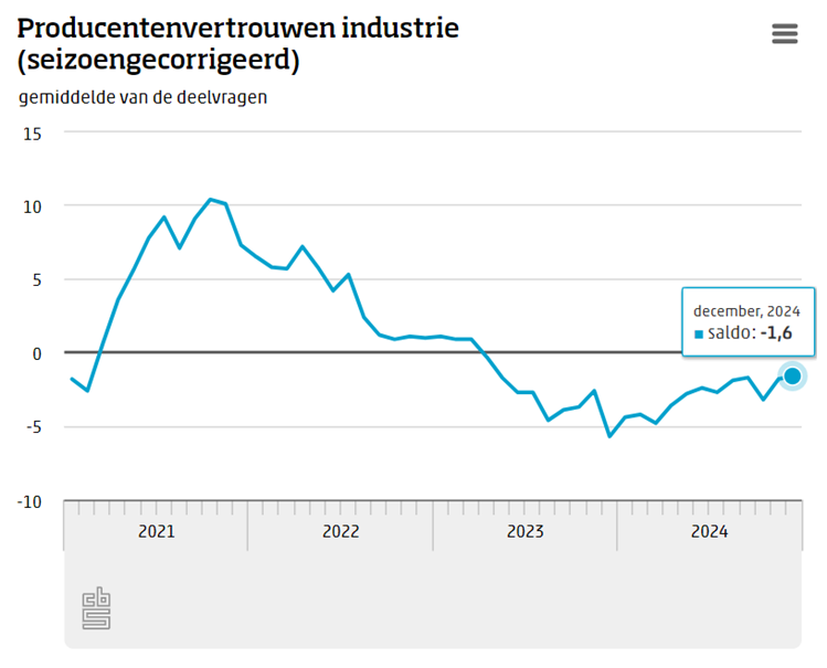 Volgens cijfers van het CBS blijft het producentenvertrouwen in de industrie negatief, met een lichte verbetering in december 2024 van -1,8 naar -1,6. Producenten zijn iets positiever over hun orderportefeuilles en toekomstige productie, maar beoordelen hun voorraden negatiever.