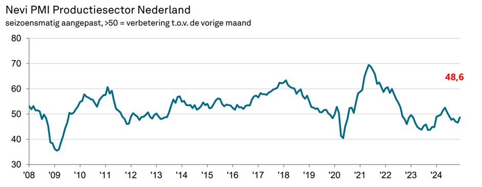 De Nederlandse productiesector kende eind 2024 een lichte opleving. De Nevi PMI®, een belangrijke indicator voor de sector, steeg van 46,6 naar 48,6 in december. Hoewel dit nog steeds op krimp wijst (een waarde onder de 50 betekent afname), is de situatie minder verslechterd dan eerder.