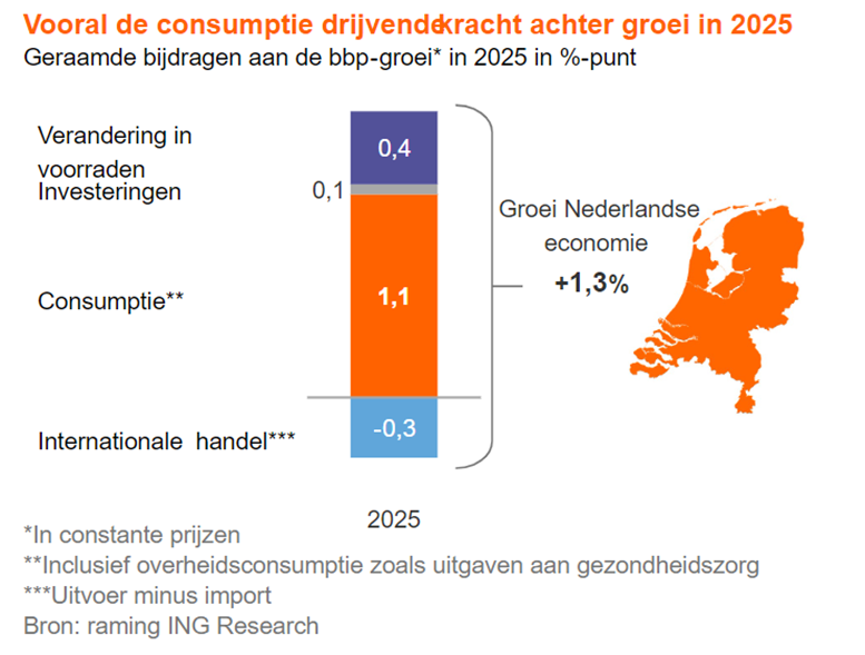 Volgens ING Research groeit de Nederlandse economie in 2025 naar verwachting met 1,3%, een verbetering ten opzichte van de zwakke groei van 0,8% in 2024. Deze gematigde groei wordt vooral gedreven door binnenlandse vraag, met consumenten en overheid als belangrijkste trekkers. Toch zijn er een aantal uitdagingen: