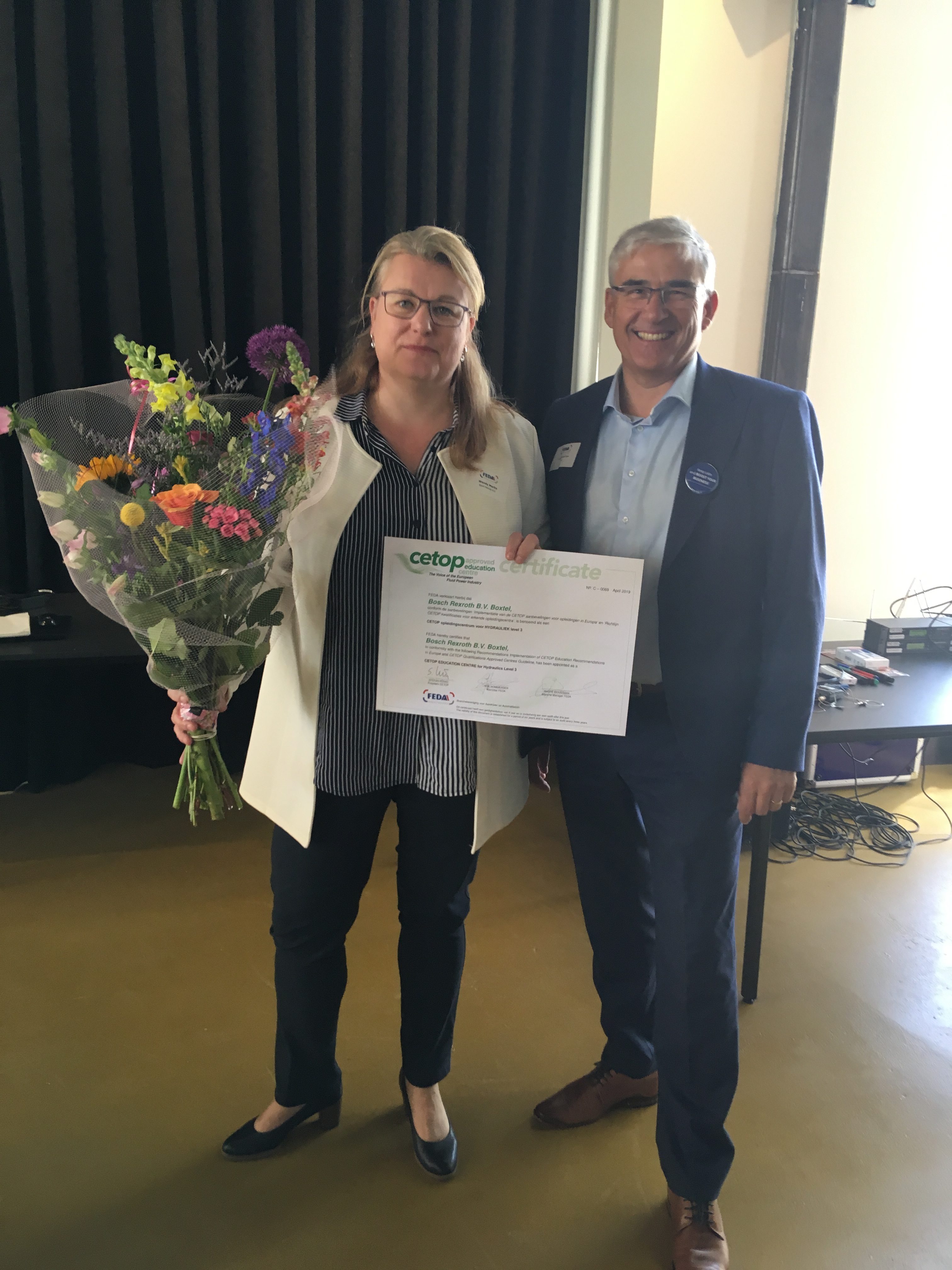 Wendy Merkx van Bosch Rexroth ontvangt het ‘CETOP Education Centre for Hydraulics level 3’ certificaat uit handen van André Braakman tijdens het FEDA Ledenevent op 24 mei.